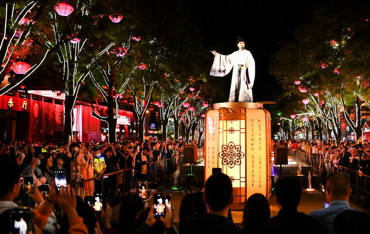 华灯初上,大唐不夜城一处高台上,诗仙“李白”腾空而立,与数百名游客齐诵《蜀道难》,蔚为壮观。
